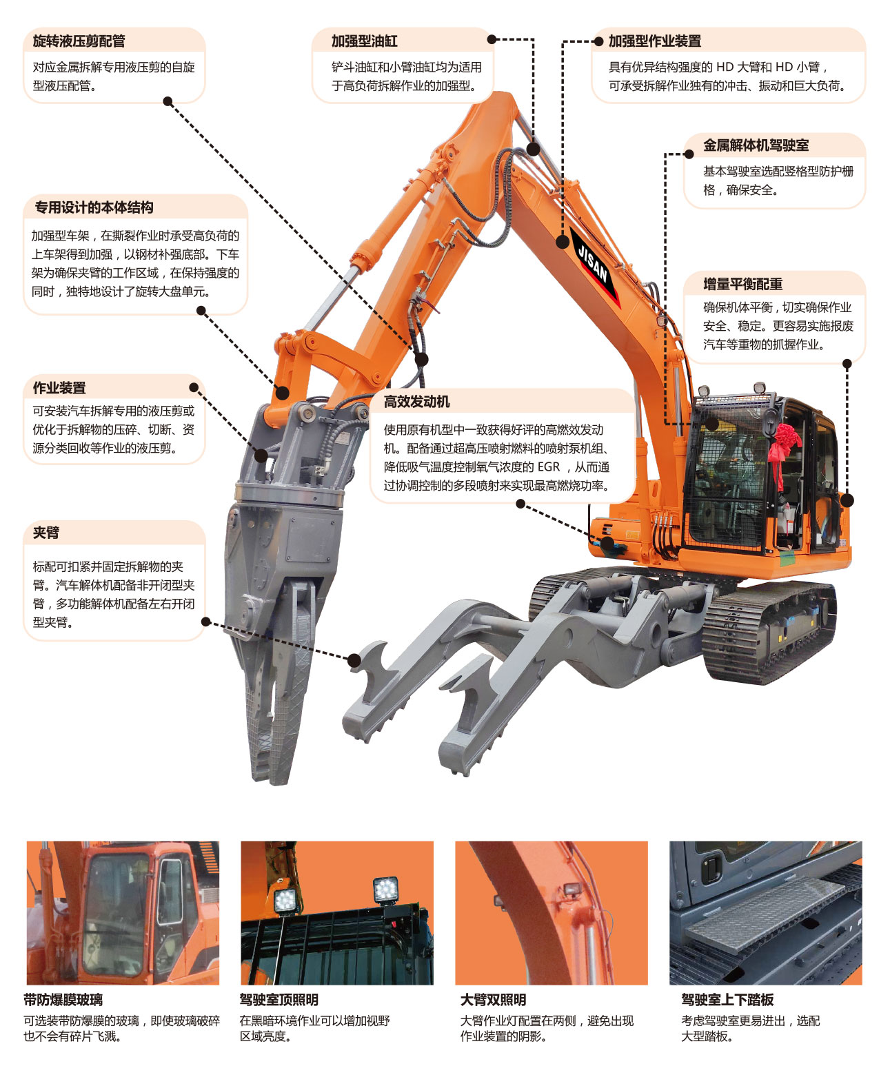 ● 采用汽車拆解機(jī)專用設(shè)計(jì)的作業(yè)裝置,增強(qiáng)適應(yīng)性、提高效率。